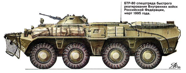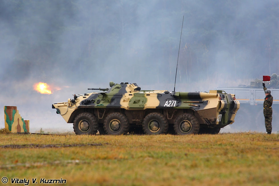 Бронетранспортер БТР-80 создан на базе БТР-70. Принят на вооружение в 1986 году. Закрытый сварной корпус из катанных броневых листов обеспечивает защиту от пуль и осколков. Для облегчения выхода десанта нижние секции боковых двухстворчатых люков используются в качестве подножек. Силовая установка состоит из дизельного двигателя ЯМЗ-238М2 мощностью 240 л.с. Колесная формула -8x8, бескамерные пулестойкие шины имеют центральную систему регулирования давления воздуха. Подвеска колес индивидуальная, торсионная. Для движения на воде используется водометный движитель.